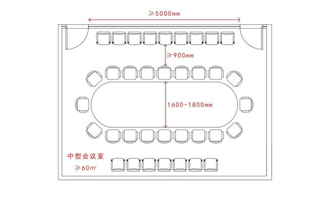 6.4.4 中型會議室面積不宜小于60㎡、可供15~50人會議;中型會議室的會議桌桌面尺寸為1.6m~1.8m;桌子高度0.75m~0.8m;如該辦公室位于高層建筑的內,依據《高層民用建筑設計防火規范》規定,達到60平方的獨立開間需設計兩個以上的安全疏散出口,其相鄰兩個安全出口最近邊緣的水平距離不應小于5m。