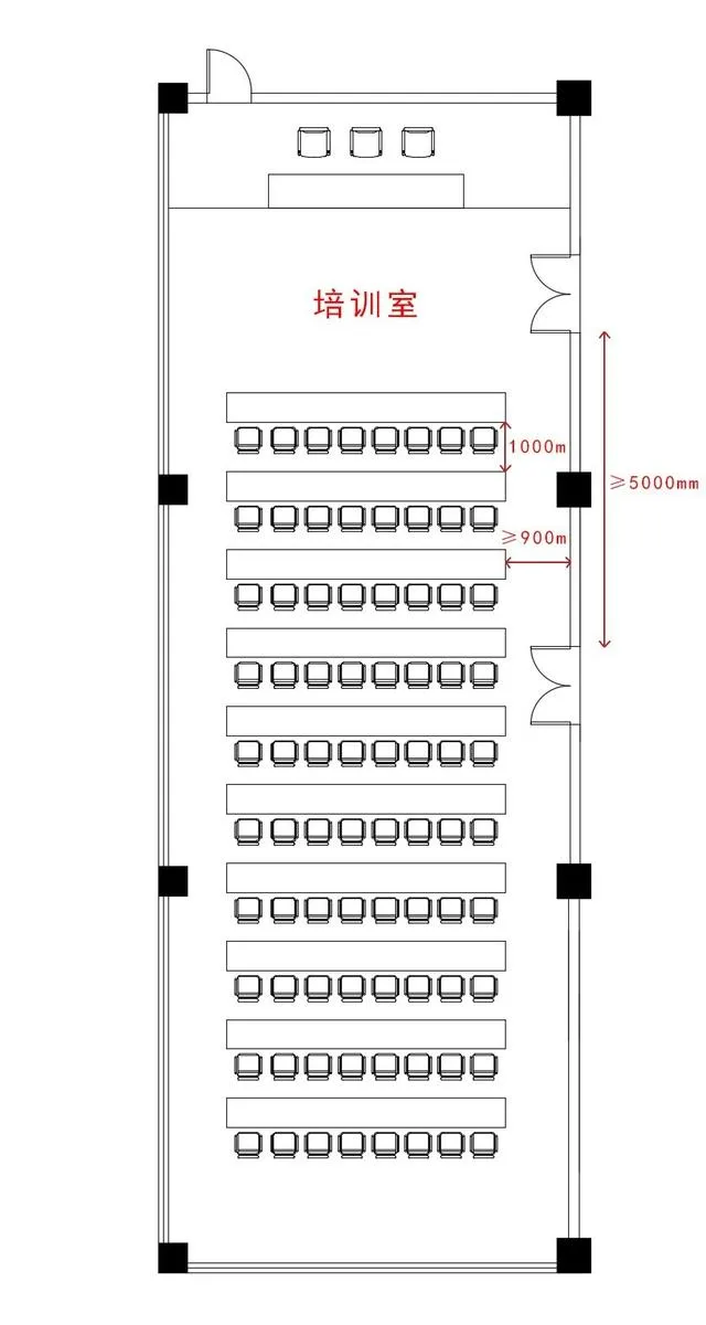 6.4.5 培訓室前后桌子的距離應不小于0.9m~1m;椅子與墻面的中間過道不應少0.9m。培訓桌桌面寬度為0.4m~0.6m ,桌子高度為0.7m~0.8。依據建筑設計防火規范規定,達到60平方的獨立開間需設計兩個以上的安全疏散出口,其相鄰兩個安全出口最近邊緣的水平距離不應小于5m。超60平方的培訓室墻面飾面應設計吸音板材。