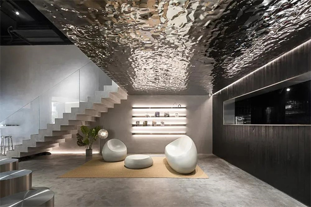 “水波紋板”顧名思義就是表面紋理類似水波蕩漾,裝飾性極強(qiáng)一種板材。作為吊頂?shù)葏^(qū)域的點(diǎn)綴裝飾,不銹鋼的特殊材質(zhì)使得空間從視覺上層次更豐富。
